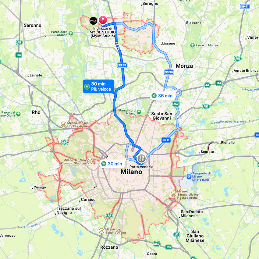 Si vienes de la zona norte de Milán, lo mejor es tomar la autopista SS35 Milano-Meda en la zona Maciachini y sucesivamente salir en Cesano Maderno.