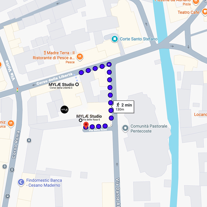 El studio se encuentra en Cesano Maderno, municipio de Monza y Brianza. En Google Maps, la dirección oficial es Corso della Liberta 5, pero la entrada más conveniente es Via delle Rose 6.